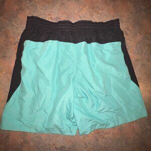 These Nike athletic shorts offer a comfortable fit with an elastic waistband and drawstring. Made from polyester, they are durable and lightweight. The turquoise and black color scheme is stylish, complemented by the iconic Nike swoosh logo.