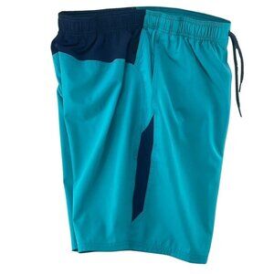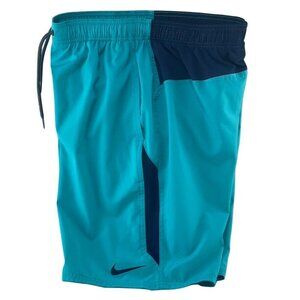 These swim shorts from Nike are designed for optimal comfort and movement. The turquoise color with contrasting navy accents provides a stylish look, ideal for water activities. The shorts feature a drawstring closure and an elastic waistband to ensure a secure fit.