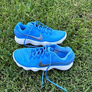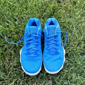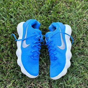 university blue, low-top, basketball sneakers, silver accents, athletic, running shoes, lightweight, sporty footwear, court-ready, breathable fabric