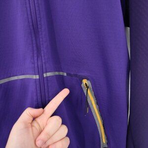 Stay warm and show off your team pride with the Nike Minnesota Vikings NFL Onfield Apparel Zip Up Jacket. In a striking purple color, this hooded jacket features the Vikings' logo prominently displayed. Made with Therma Fit technology, it provides excellent insulation. Please note that there is some missing reflective material and a small pull on the Nike logo, as shown in the photo.
