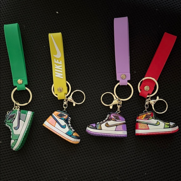 Set of four Nike mini sneaker keychains. Features green, yellow, purple, and red accents. Perfect for sneaker enthusiasts.