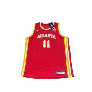 Brand new with tags Nike Dri-Fit NBA jersey featuring Trae Young (#11) of the Atlanta Hawks. Bold red with yellow and white striped side panels, “ATLANTA” across the chest, and “YOUNG” with #11 on the back. Official NBA Authentics patch at the hem. Lightweight, breathable fabric built for performance and fanwear alike.