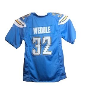 Rep your team with this officially licensed Nike NFL On Field Los Angeles Chargers Eric Weddle #32 jersey in youth size medium. Features the Chargers powder blue colorway, stitched NFL shield at neckline, printed team graphics, and lightning bolt details on the shoulders.