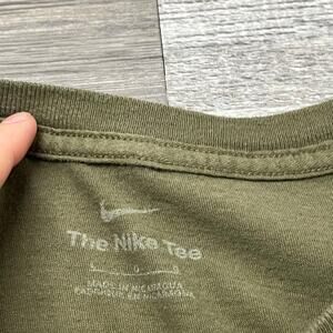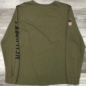 In good pre-owned condition, olive green blue red black, lightweight, cotton, long sleeve, crewneck, ribbed cuffs and collar, center and sleeve logos, spell out logo, Nike swoosh, pullover, casual, athletic, sporty, football, The Nike Tee.
