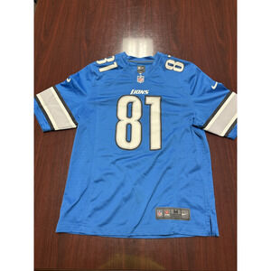 The product is a Nike NFL on-field Detroit Lions Calvin Johnson #81 jersey in size M, featuring the official team colors of blue. This officially licensed jersey is perfect for fans of the Detroit Lions and Calvin Johnson, ideal for football enthusiasts looking to show their support during the regular season. The jersey is designed for unisex adults and is a must-have for any serious fan of the National Football League.