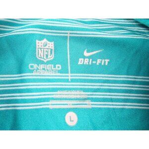 The product is a Nike NFL Onfield Apparel shirt in size Large for men, featuring the Miami Dolphins in aqua and white stripes. Officially licensed by the National Football League, this shirt is perfect for football fans looking to show their support during the regular season. Made in China, this shirt is a must-have for any Dolphins supporter wanting to represent their favorite team in style.