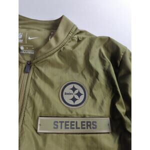 Show your team pride and support for our troops with this Nike NFL Steelers Salute To Service Jacket. This olive green jacket is a size medium and features the Steelers logo, along with the Salute To Service ribbon. Perfect for game day or everyday wear.