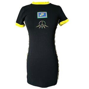 This sleek and sporty mini dress from Nike blends retro streetwear with modern feminine edge. Designed in black stretch cotton, it features bright yellow ribbed trim along the neckline and sleeves for a pop of color. The center chest logo patch includes the classic Nike logo and a colorful embroidered peace sign underneath, creating a bold yet balanced statement.