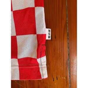 This Nike NSW reversible tank top is a standout piece, featuring a bold oversized Swoosh graphic on the black mesh side and a red and white check pattern on the reverse. Size Large. Lightweight, breathable, and perfect for workouts, layering, or streetwear styling.