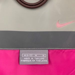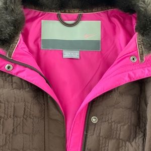 Beautiful Brown winter vest from Nike. Brow Quilted nylon with faux fur collar. Inside lining is Pink. Zips up past the chin--high collar. 2 front pockets. The Nike swoosh is made of metal. Full zipper plus snaps in front. Size Medium.