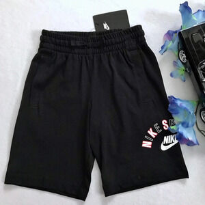 NWT. Black Performance Sweat Shorts for Boys Size S. Pull on, elastic waist with adjustable strap, graphic brand logo left side, 2 side pockets, fleece lined, knit construction. Please note and shown as a zoomed in picture, light color imperfection left leg openings. Pictures are part of description.