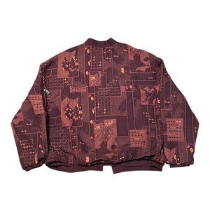The Nike Naomi Osaka Jacquard Jacket in Burgundy is a stylish and versatile outerwear piece for women in size Large. Made from 100% polyester with a geometric jacquard fabric, this basic jacket features a button closure and long sleeves, making it perfect for all seasons. With its oversized fit and short length, this jacket is both comfortable and fashionable, suitable for various activities such as tennis, walking, and skateboarding. The colorful design with a blend of cultural themes makes it a standout piece in your wardrobe, representing a mix of countries and ethnic styles.