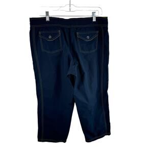 Excellent preowned condition. Navy blue lightweight elastic waist cropped track pants with yellow trim & stitching. Snap flap pockets on back. Zipper/button closure. Cotton/polyester material. Approx. measurements: Waist 34", inseam 24", rise 10". Size L.
