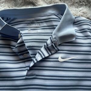 Classic Nike polo with navy and white stripes. Comfortable and stylish for any occasion. New without tags