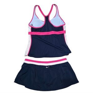 Chic Nike tankini set featuring a navy T back tank with pink and white accents and a matching mini skirt with slit up front side. Has embroidered logos on both front of tank and back center of skirt. lines in lt blue
