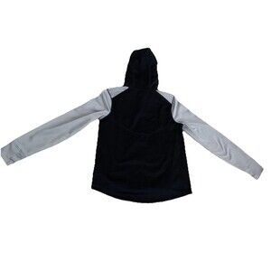 Nike Genuine Merchandise New York Yankees Womens Full Zip Hooded Jacket. The jacket is black with gray sleeves. Each sleeve cuff has a thumb hole. There are 2 side pockets. The NY logo is on the front of the jacket. The inside of the jacket is lined with fleece.