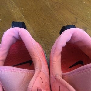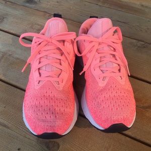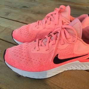 Womens Nike Odessey React running shoe in size 8. Soles in excellent condition. There is mud stains in between the sock sleeve and the outer knit fabric, see photos. Otherwise in very good condition. If you are a fan if this shoe, you know it runs small. Photos look a bit pinker, they are a bit more peachy in color. Very comfortable shoe.