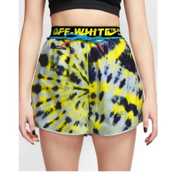 Nike Off-White Vibrant tie-dye shorts by Off-White, featuring a striking yellow and blue pattern. Perfect for a bold, casual look.