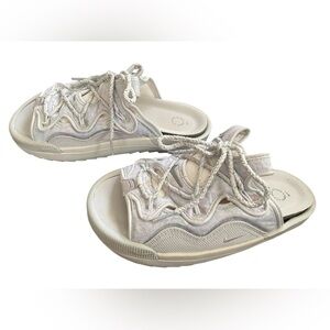 Trendy open-toe sneakers featuring unique lace design.