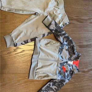Olive tee with mountain graphic. Blue shorts with white accents. Ideal for active wear. Both size medium.
