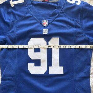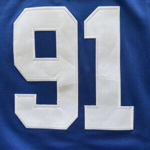 -Features: V-neck; sewn on logos and Justin Tuck name and #91