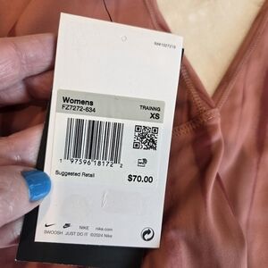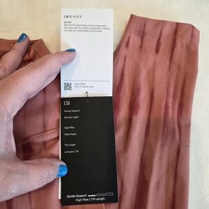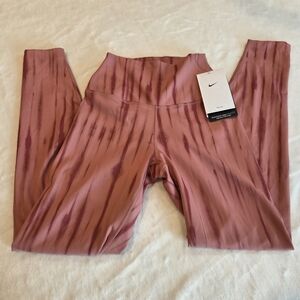 Step up your training game with these brand new, tags-attached Nike One Dri-FIT Women's Training Leggings. Designed for versatile performance, these high-rise, 7/8 length leggings offer "Gentle Support" and feature Nike's signature Dri-FIT technology to wick away sweat, keeping you dry and comfortable during any activity. The unique "Pecan" or "Rose Clay" tie-dye/striped pattern in shades of dusty rose and deeper reddish-brown adds a stylish touch. Made from a blend of 80% Polyester and 20% Spandex, these leggings provide excellent stretch and shape retention.