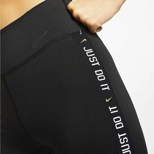 Style Description: 7/8 length leggings with stretchy glittering cuff and “Just Do It” stripe running up either side of legs | Dri-fit | Mid-rise | Tight fit | Two open-top pockets sewn into waistband - one small (for keys or earpods), and one larger one at the small of back (cash, credit card, maybe a phone)