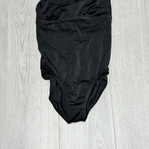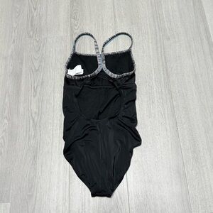 Nike one-piece swimsuit features a sleek black design with a sporty and modest cut, perfect for swimming. Made from durable swimwear material, it offers both style and functionality for any aquatic activity. Has keyhole back