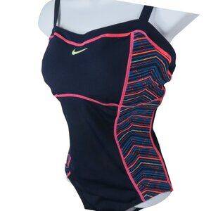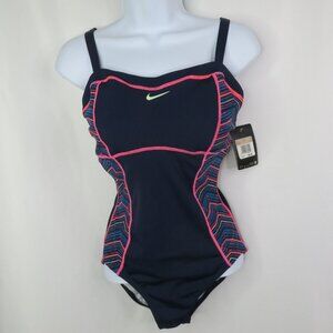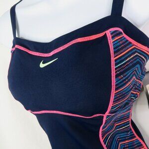 Nike swim training one piece swimsuit. Straps are adjustable, shelf bra with removable foam inserts, chlorine resistant fabric in navy, with blue, fluorescent pink and orange side panels . Brand new with original tags.