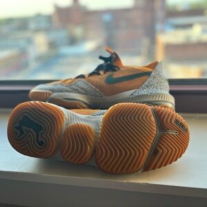 Stylish Nike men's shoes. Features vibrant orange and gray design. Comfortable and trendy.