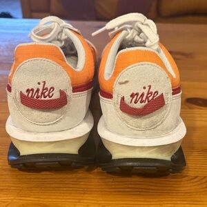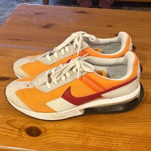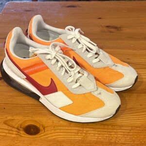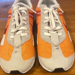 Vibrant Nike athletic shoes. Features orange and red design. Comfortable and stylish.