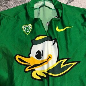 Insanely awesome set of speed suit made by Nike in bright green Oregon Ducks color. It's just a bit tight for me, so I don't really get to wear these anymore. Size is small. Zipper in the front. Great condition too, just the Pac12 emblem is starting to peel off.