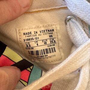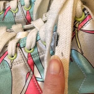 Great condition, some markings here and there that would easily come out in a wash. Laces on left shoe have black stain about 1/2" long and some slight unraveling of laces as seen in photo.