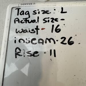 Tag size: Large. Actual measurements: Waist 16 inches flat, Inseam 26 inches, Rise 11 inches.