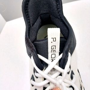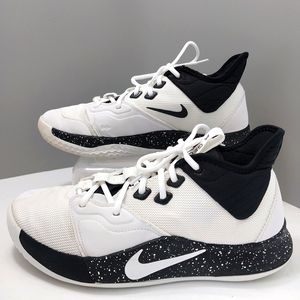 Nike Paul George 3 Sneakers, Size 7.5M|9W|EUR 40.5, leather and fabric uppers, white and black, "Don't tell me the sky's the limit when there are footprints on the moon" embossed on soles, pre-owned, great condition, light wear, photos taken, insole toe to heel 10 3/4", widest part of toe 3 1/4", photos show true condition of shoes