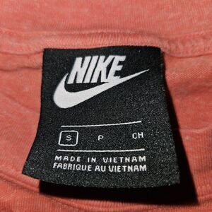 Nike women's long sleeve sweater in a peach/salmon hue, size small. Made from lightweight cotton, featuring a classic crewneck design.