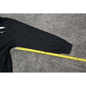 The Nike Performance Full Zip Jacket in Men's Size XL is a versatile and stylish outerwear piece perfect for various occasions. Made from lightweight polyester material, this mid-length jacket features a solid black color with white accents.