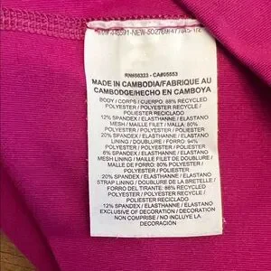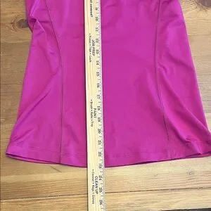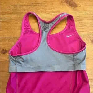 Sleeveless DRIFIT racerback design for ease of movement. Bright hot fuchsia with small grey Nike Swoosh logo at chest. Lightweight, breathable performance fabric. Built in full coverage bra. Ideal for workouts or casual wear.