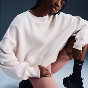 Nike Sportswear Fleece Phoenix Over-Oversized Crew Neck Sweatshirt in light pink. Super comfy and relaxed slightly dropped fit. Long sleeve pullover with Nike swoosh logo at the center chest. 80% cotton/20% polyester. Women’s size small. Pre-owned in very good condition, no holes or stains.
