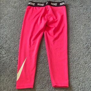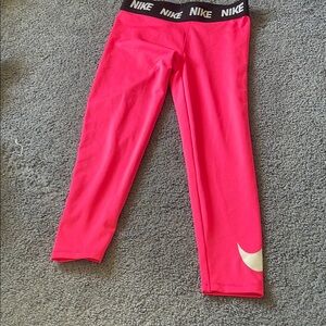 These vibrant pink leggings from Nike feature a bold swoosh logo on one leg, adding a touch of sporty style. The stretchy, form-fitting material ensures comfort and flexibility, making them perfect for active pursuits. The contrasting black waistband with white branding adds a chic finish to these cropped leggings.