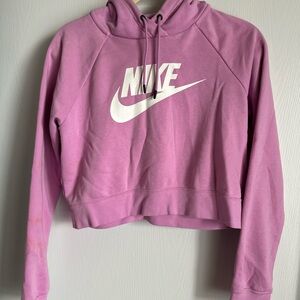 This Nike sweatshirt features a trendy cropped design with long sleeves, perfect for a stylish and comfortable look. The pink hue is complemented by a bold white Nike logo on the front, adding a graphic touch to the classic sweatshirt style. Ideal for casual outings, this top combines fashion and function effortlessly.