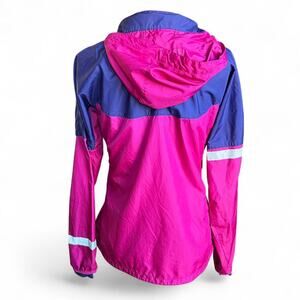 neon pink, purple accents, windbreaker jacket, reflective strips, athletic wear, sporty style, lightweight, recycled polyester, jogger jacket, outdoor active