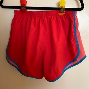Pink and blue striped Nike Dri-fit running shorts with mesh underlining.