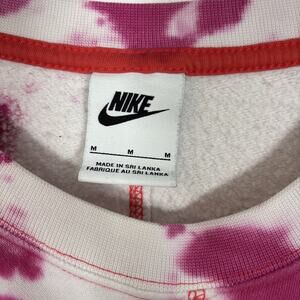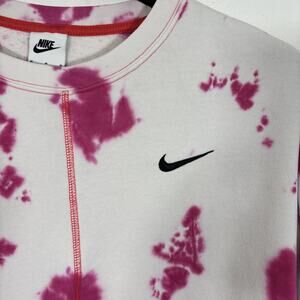 The Nike Pink White Tie Dye Cropped Sweatshirt in medium size is a stylish and comfortable pullover sweatshirt designed for women. Made from a blend of polyester, spandex, and cotton fleece fabric, this sweatshirt features an embroidered Nike Swoosh logo on the front, adding a touch of sporty flair to the outfit. The tie-dye pattern gives it a fun and colorful look, perfect for casual wear or athletic activities like gym training and running. With its oversized fit and crew neck neckline, this sweatshirt is versatile and can be worn throughout the seasons for both fashion and functionality.