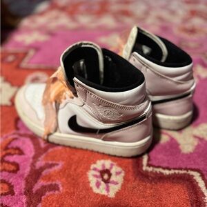 Stylish Nike sneakers with a pink exterior and black interior. Comfortable and trendy design. Air Jordan with ballet core pink laces. High top style. Gently worn with lots of life left!
