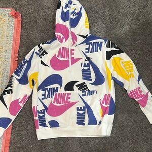 This Nike hoodie combines vibrant pink and blue hues with a playful all-over logo print, creating a bold and sporty look. Crafted from comfortable fabric, it features a pullover style with a hood and long sleeves, perfect for casual outings. The scattered Nike swoosh logos add a dynamic touch to this standout piece.