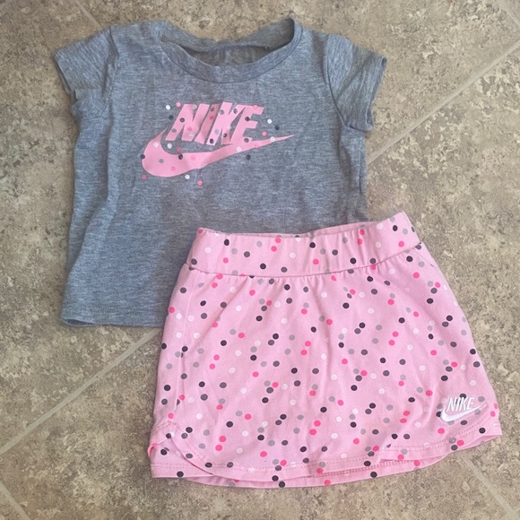 Adorable Nike set with a gray top and pink polka dot skirt. Ideal for playtime.