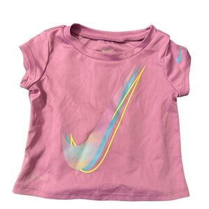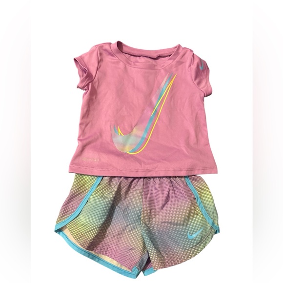 Pink top with multicolor Nike logo. Multicolor shorts with blue trim. Comfortable and stylish.