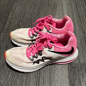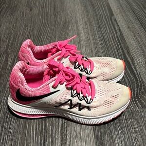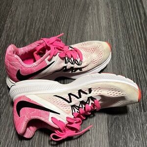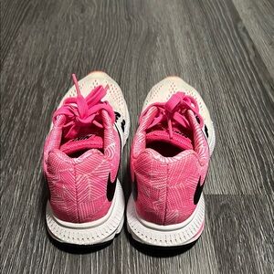 Step up your athletic game with Nike's vibrant pink and orange athletic shoes, designed for both style and performance. These shoes feature a striking pink hue on the laces and inner lining, complemented by a subtle orange accent at the toe, creating a dynamic color palette. With a substantial sole and breathable mesh upper, they offer comfort and support for all your running needs.