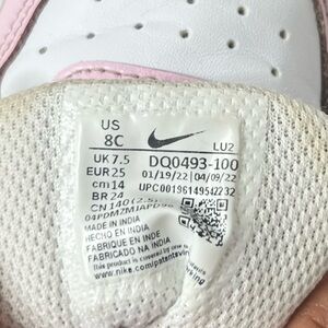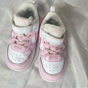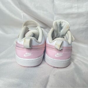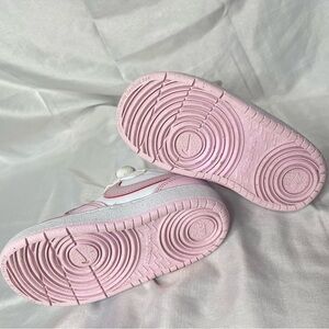 These Nike sneakers feature a charming pink and white color palette, highlighted by a low-top design and easy-to-use Velcro straps. The shoes offer a classic silhouette, combining style and comfort for everyday wear.